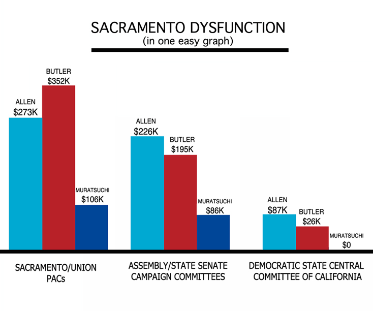 Before the June primary, few Sacramento Democrats, including both John Perez and Betsy Butler had made any financial contributions to Muratsuchi, forcing the candidate to loan his campaign $45,000 to defend the new South Bay Assembly seat against two Tea Party candidates, Nathan Mintz, who ran and lost a close race against Butler in 2010, and Craig Huey, who ran an unsuccessful $500,000 self-financed congressional campaign against Janice Hahn last year.